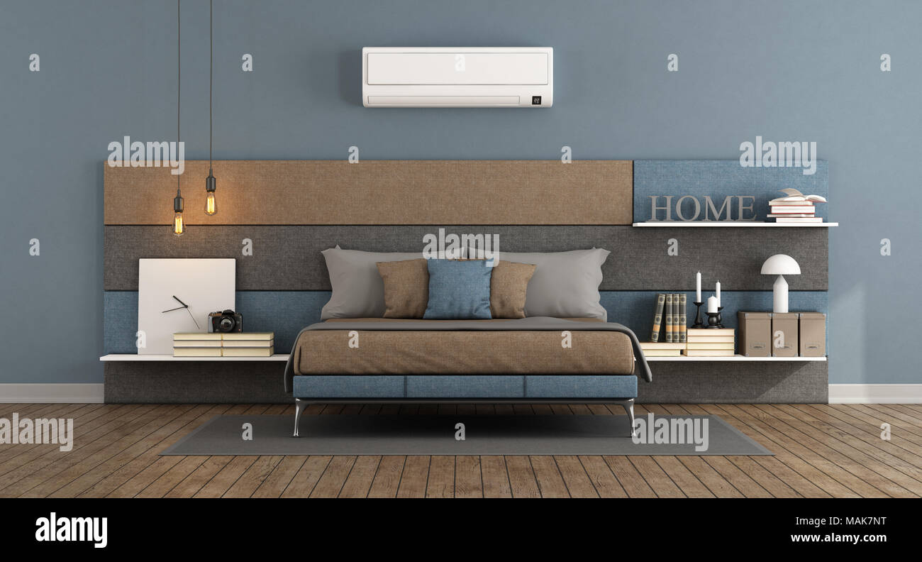 Dormitorio Moderno Con Cabecero De Cama En Tela Con Estantes Y Acondicionador De Aire 3d Rendering Fotografia De Stock Alamy