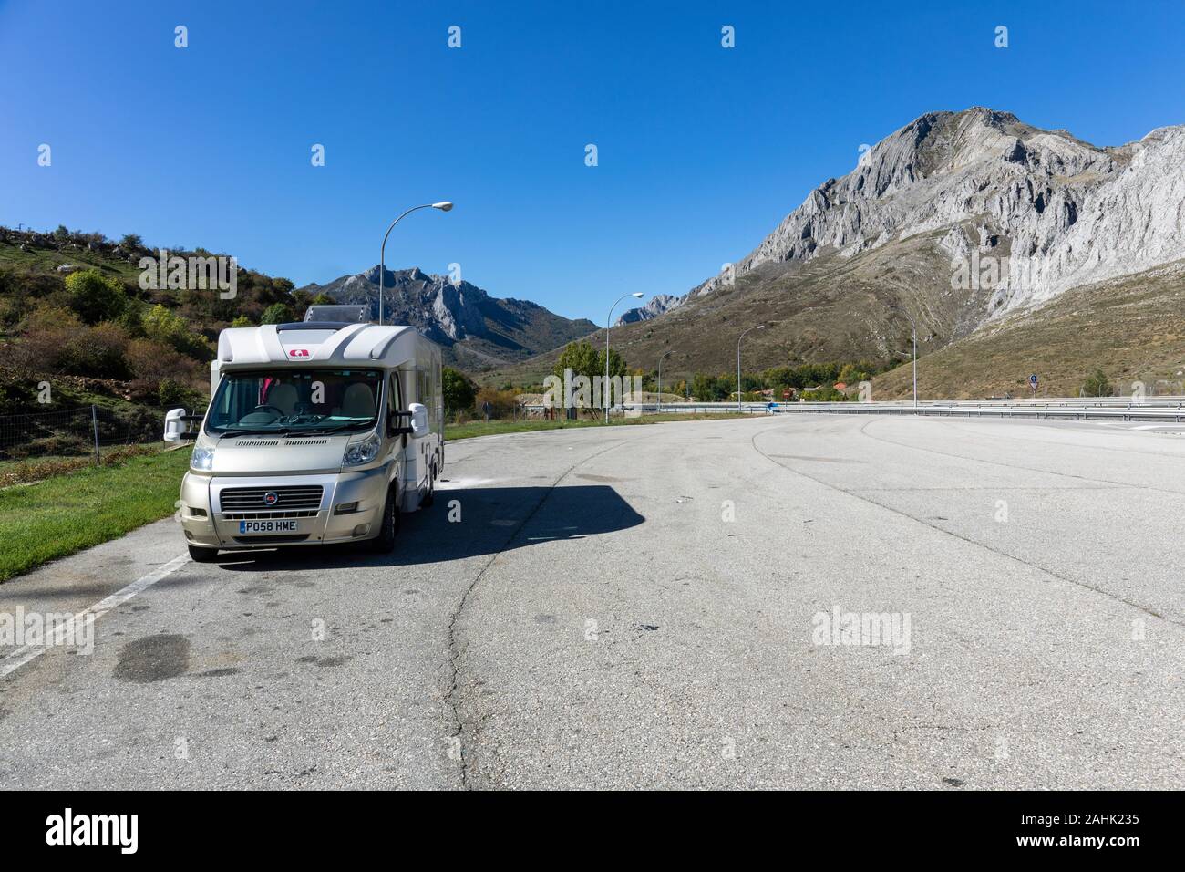 La Casa Rodante Se Detuvo En La Zona De Descanso Desierta De La Autopista Caldas De Luna Espana Fotografia De Stock Alamy