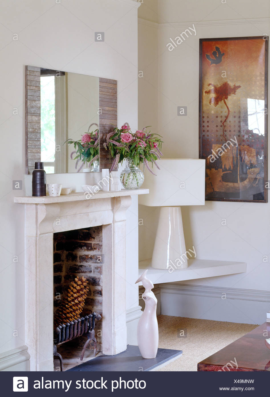 Espejo Sobre La Chimenea En Blanco Simple Habitacion Moderna Con Luz Blanca Sobre La Mesa De Esquina Fotografia De Stock Alamy
